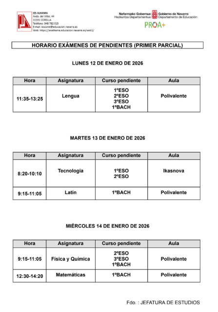 Dirigido a familias de 1º y 2º bachillerato. El próximo martes 13 de enero a las 17:00h, el director del área del campus de Tudela de la UPNA Santiago Sánchez Alegría, acudirá al auditorio de Corella, donde se llevará a cabo una sesión informativa con las familias de alumnado de 1º y 2º bachillerato del IES ALHAMA de Corella. Se tratarán temas como: PAU, ponderaciones, oferta educativa, etc y se resolverán las dudas que las familias puedan tener.